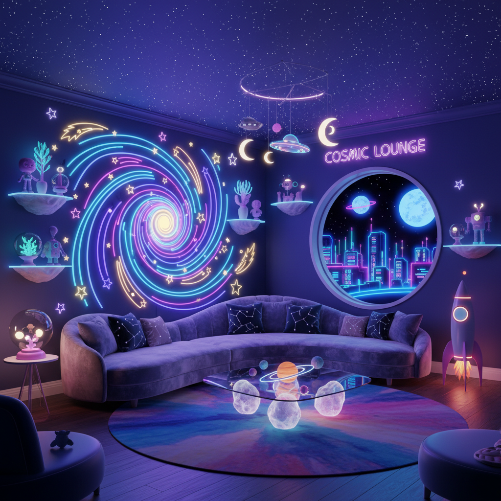 Every bungalow is designed to be an immersive cosmic experience from the moment you walk through the door. Galaxy-painted ceilings stretch overhead. Neon-lit common areas pulse with retro-futuristic energy. Rocket ship bunk beds launch little imaginations into orbit. This isn't just a vacation rental — it's a portal. Every corner, every detail, every glow-in-the-dark surprise is part of the adventure. You're not staying somewhere. You're living inside a story.